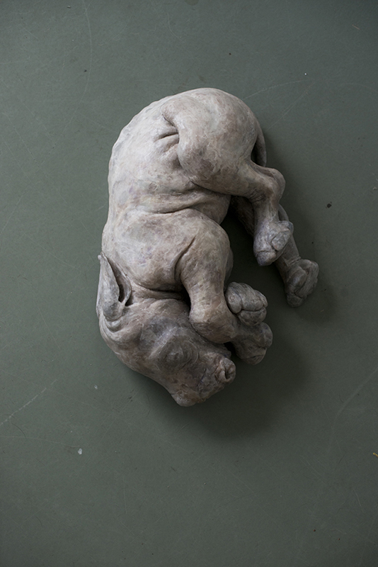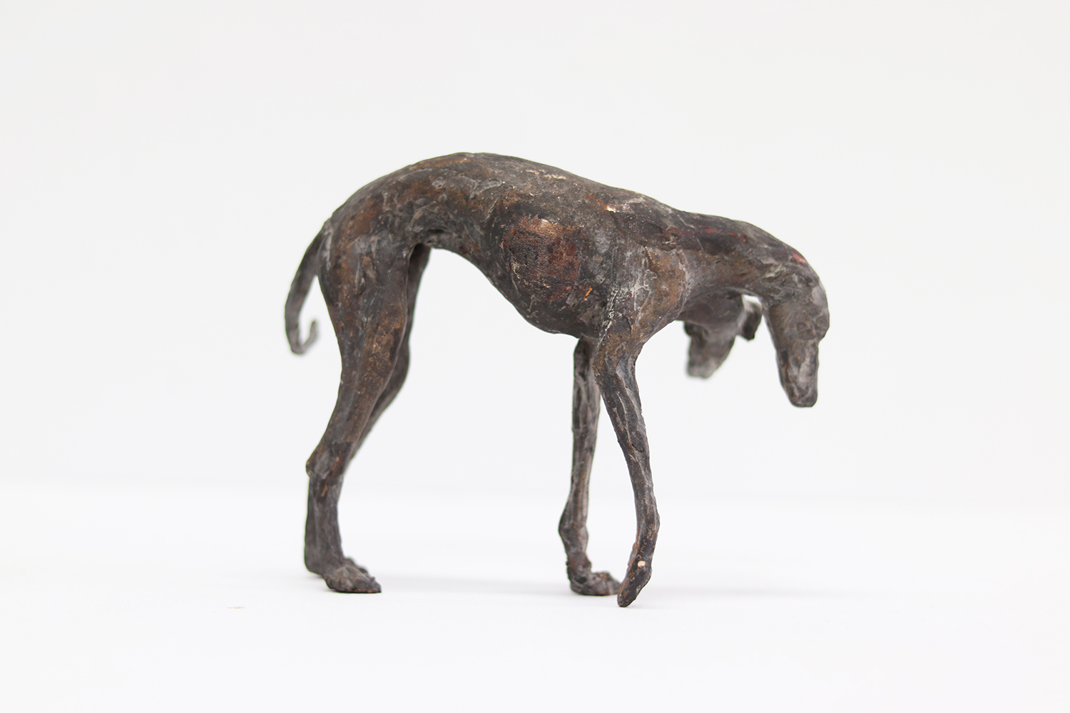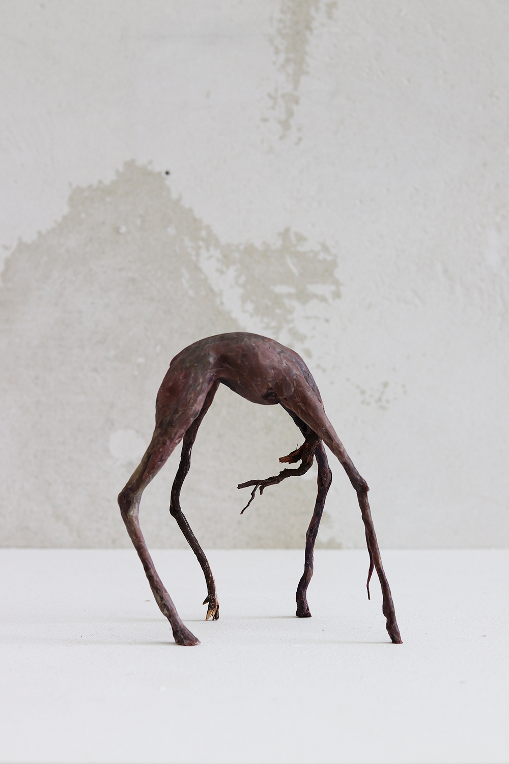 Miriam Knibbeler maakt sculpturen van was, brons of keramiek. De beelden zijn herkenbaar als mensen of dieren, maar het zijn vooral lichamen: kwetsbaar en toegankelijk. Het zijn aanwezigheden die hun plaats innemen in de ruimte. Het zijn nooit portretten van individuen. Het gaat haar er ook niet om een specifiek ras of soort uit te beelden. In Miriam Knibbeler’s werk is vervreemding altijd aanwezig, maar op een subtiele manier, meer voelbaar dan zichtbaar. Of de beelden nu ruimtevullend zijn of passen in een menselijke handpalm, ze lijken zich in een schemerwereld te bevinden. Vaak zijn het verstilde, naar binnen gekeerde beelden. De transparantie van het materiaal maakt hen aanwezig en afwezig tegelijk. Kaal als de beelden zijn, wil de kunstenaar een kern laten zien, voorbij de fysieke oppervlakte: daar waar alle wezens hetzelfde zijn. Ze probeert het onbenoembare aan te raken en bevraagt zo het raadsel van leven en dood. Qua vormtaal staan Miriam Knibbelers beelden in de klassieke traditie, maar haar inhoudelijke zoektocht en het materiaalgebruik maakt ze tot hedendaagse kunstwerken. Oftewel: met haar wortels in de traditie, zoekt de kunstenaar op een eigentijdse manier naar betekenis.