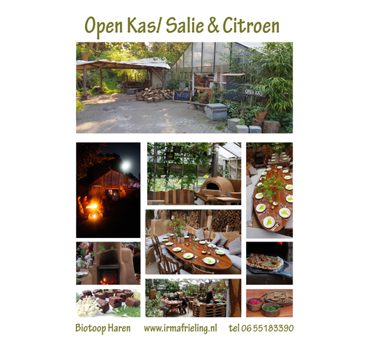 De Open Kas is een unieke buiten-locatie op de Biotoop. Liggend tussen de Zelfoogsttuin en een kleine tuin met veel fruit bomen. Het kan gehuurd worden voor een feestje, activiteit (zonder versterkte muziek), met of zonder catering van Salie & Citroen.