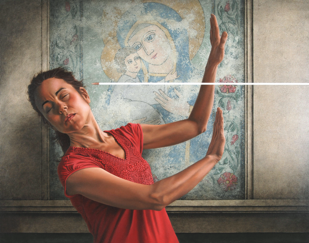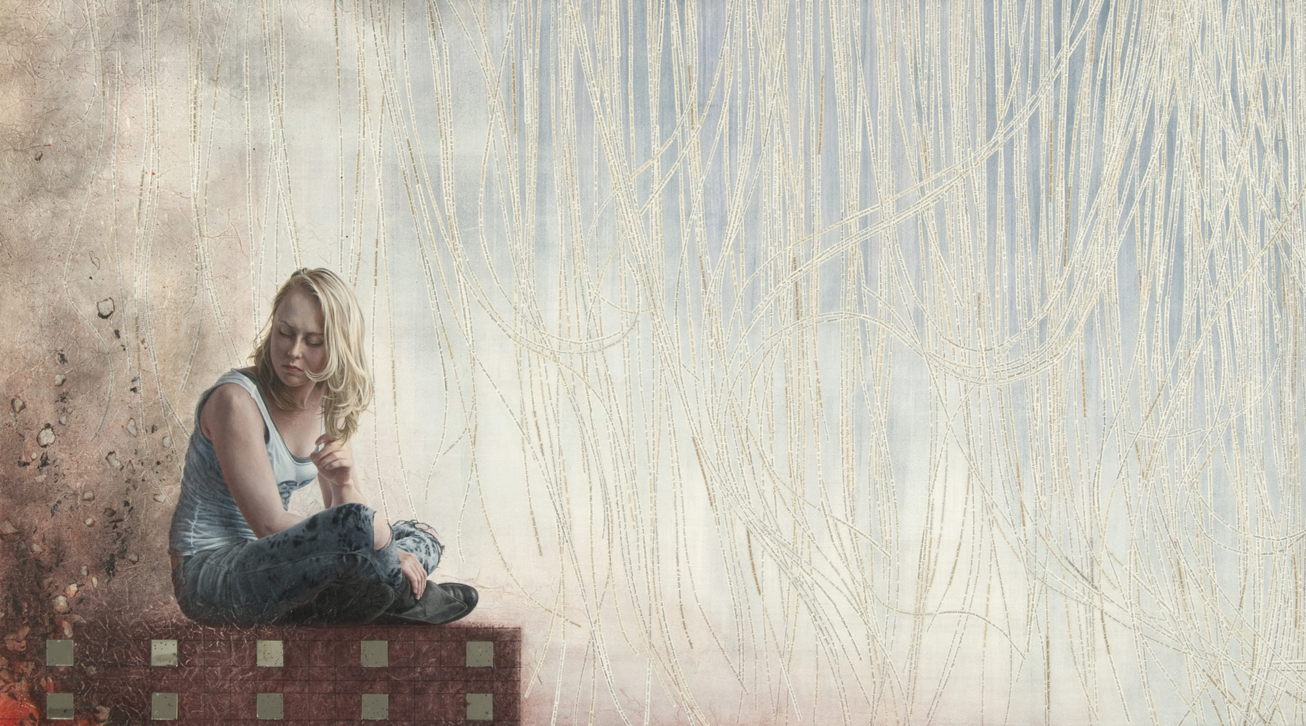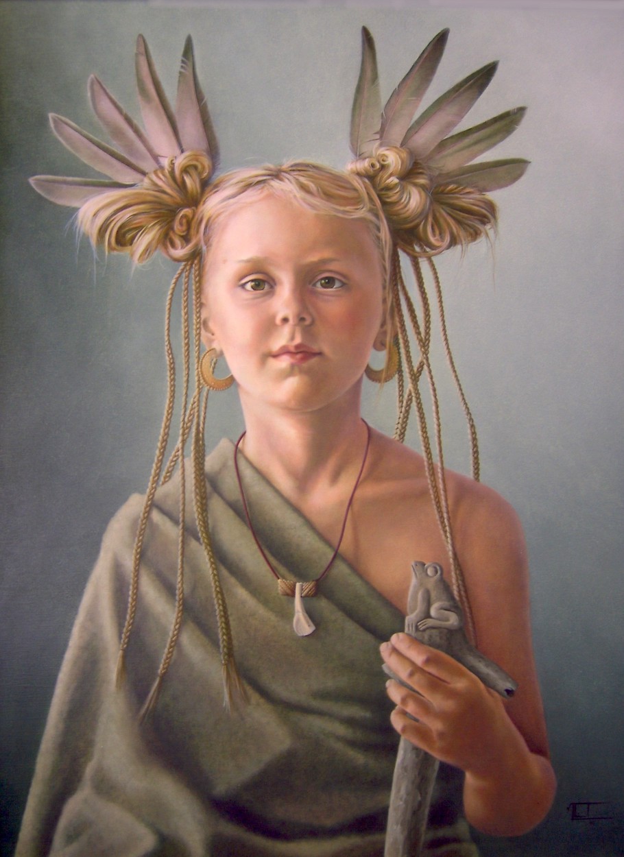 In mijn portretwerk combineer ik papier, textiel en/ of objecten met een uiterst verfijnde schildertechniek, waardoor de afgebeelde figuur een middel wordt om de toeschouwer mee te nemen naar een irreële ruimte of ervaring.
