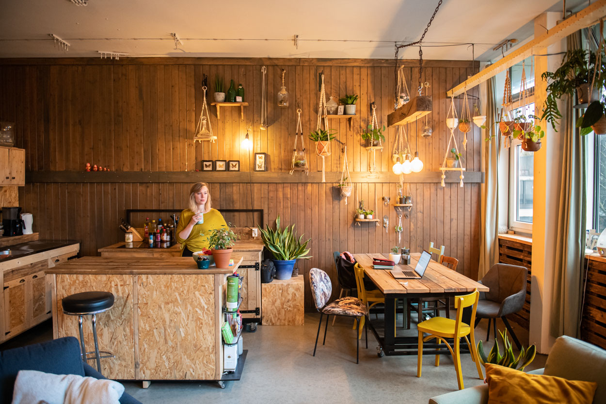 Van een oud biologie lokaal heb ik mijn droomplek gemaakt met geupcyclede spullen en gebruikt steigerhout. Mijn plantenwand is een work-in-progress en ik houd een hoek in mijn woonruimte vrij voor het schilderen van grote realistische portretten. In een andere vleugel van de Biotoop werk ik in het bedrijf OneDayArtist. Je zou kunnen stellen dat ik deze plek bijna niet verlaat, maar dat is gelukkig niet het geval.
