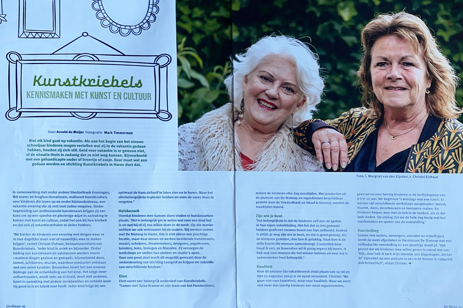 In de Biotoop vind je allerlei creatievelingen, kunstenaars en ondernemers die op allerlei manieren bijdragen aan maatschappelijke projecten. Eén van deze initiatieven is Stichting Kunstkriebels, mede opgericht door Biotoper Margriet van den Eijnden. Deze stichting zet zich in om kinderen die anders niet de kans zouden krijgen op vakantie te gaan, een prachtige vakantieweek te bieden, vol kunst, cultuur en creativiteit.